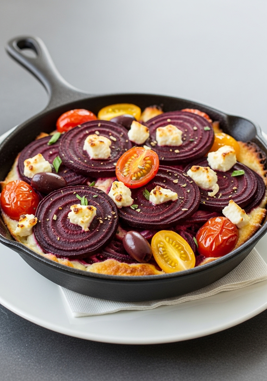 Delight in spiralized beet noodles combined with juicy tomatoes, zesty red onion, briny olives, and creamy Feta cheese, all baked to perfection. This versatile dish can be enjoyed as a tasty appetizer alongside crispy baked pita chips, a vibrant side, or even as a satisfying main course when topped with succulent grilled shrimp or chicken. It's a recipe you'll want to hold onto!