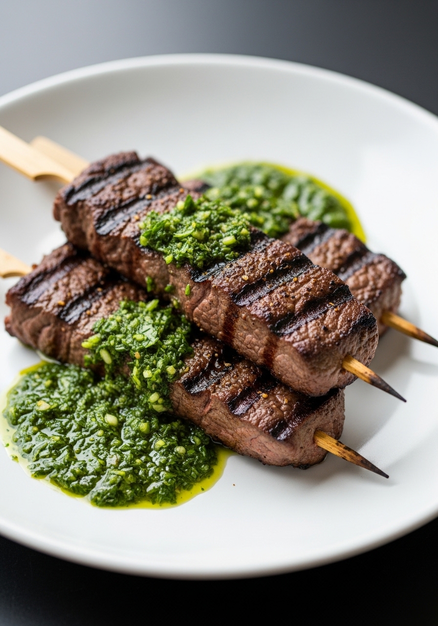 Heat the grill to high. Cook the kebabs for about 2 to 3 minutes on each side, or until they reach your preferred level of doneness, aiming for medium-rare. Once cooked, transfer the kebabs to a serving platter and generously drizzle with the chimichurri sauce.