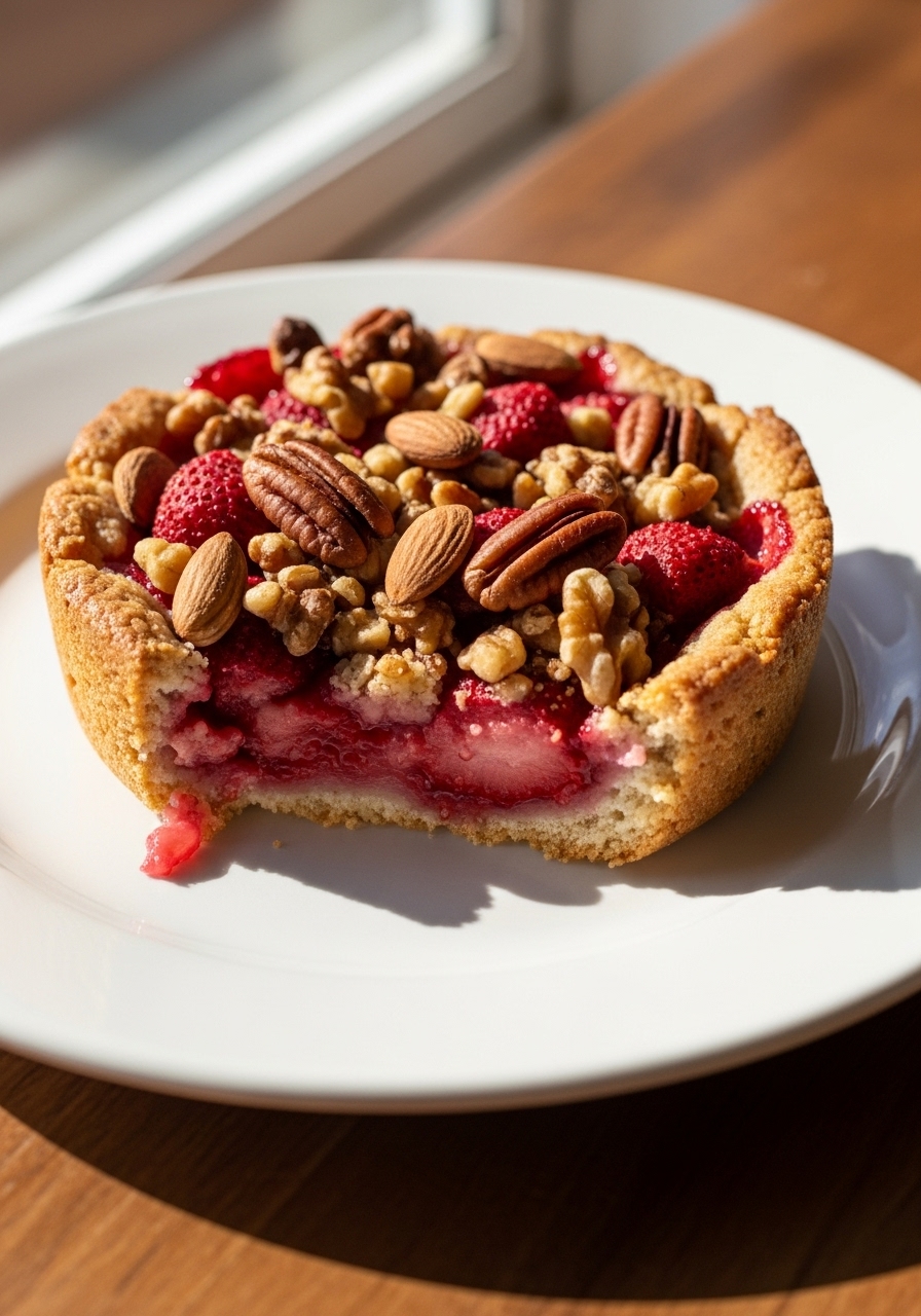 In a medium-sized bowl, mix the remaining ingredients for the nut topping using a fork, then generously sprinkle this mixture over the strawberries.