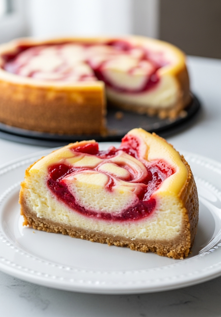 Indulge in a delightful low-fat cheesecake elegantly swirled with luscious strawberry jam, all resting atop a buttery graham cracker crust. This simple yet impressive dessert is an ideal choice for any event, offering a touch of decadence that's sure to please.