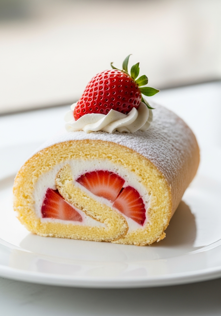 Once the cake has cooled completely, gently unroll it. Spread the whipped cream mixture over the surface and layer the strawberries on top, leaving about an inch at one end to prevent spillage, then carefully re-roll the cake.