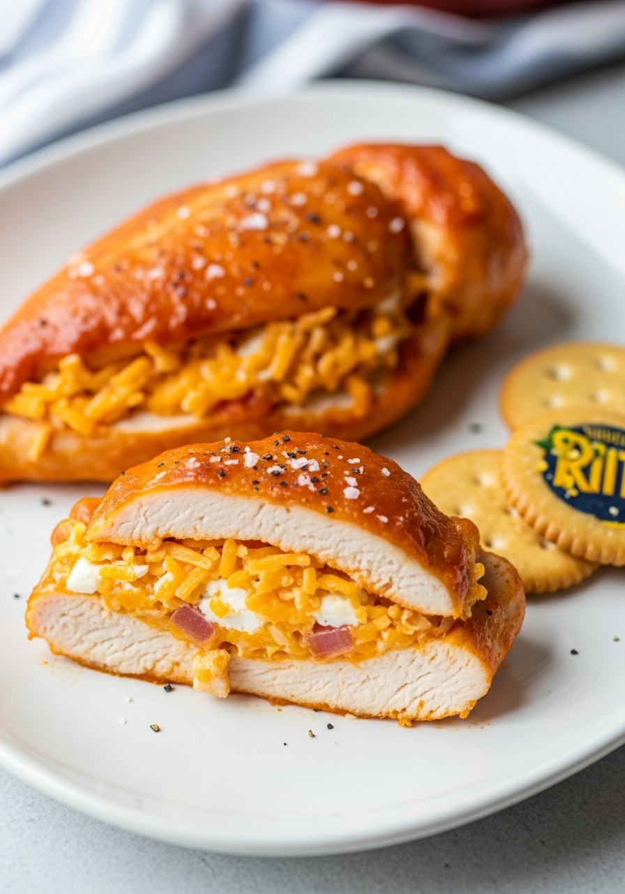 Introducing our delectable Buffalo Chicken Breasts, filled with gooey cheese, finely shredded carrots, and diced celery. These savory chicken breasts are rolled up, coated in breadcrumbs, baked to golden perfection, and finished off with a zesty drizzle of hot sauce. Tempted yet? You absolutely should be—this dish is truly irresistible!