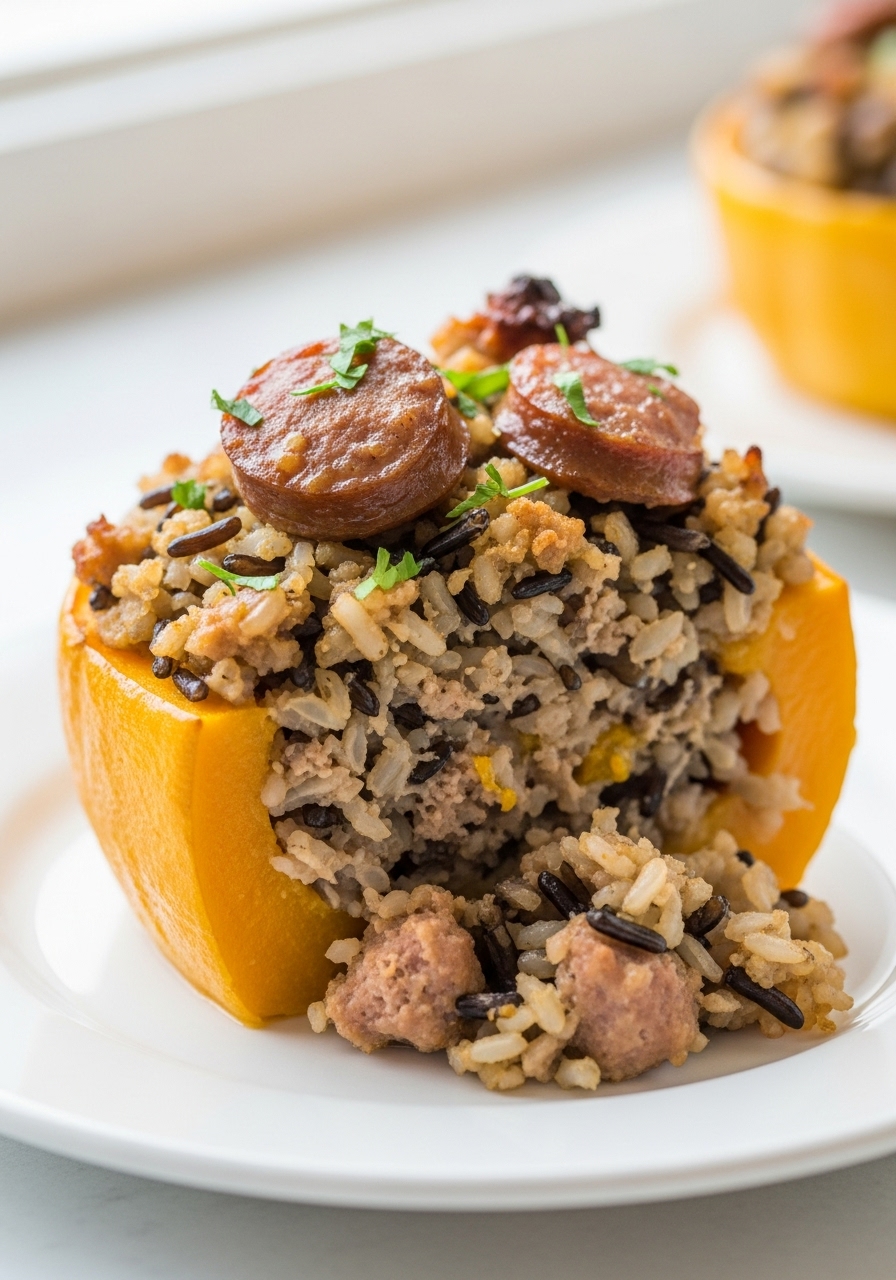 Indulge in this delightful stuffed butternut squash, a complete dish that combines savory chicken sausage with a hearty wild rice mixture, enhanced with earthy mushrooms and sweet cranberries.