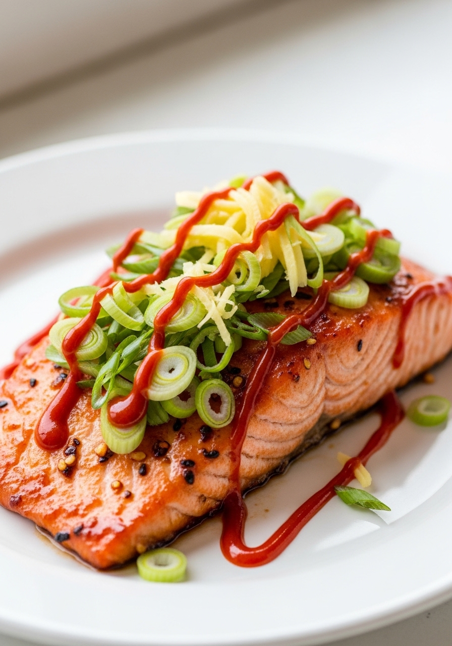 In a small mixing bowl, whisk together the red chili sauce, sriracha, and grated ginger. Use a brush to apply this mixture generously over the salmon.