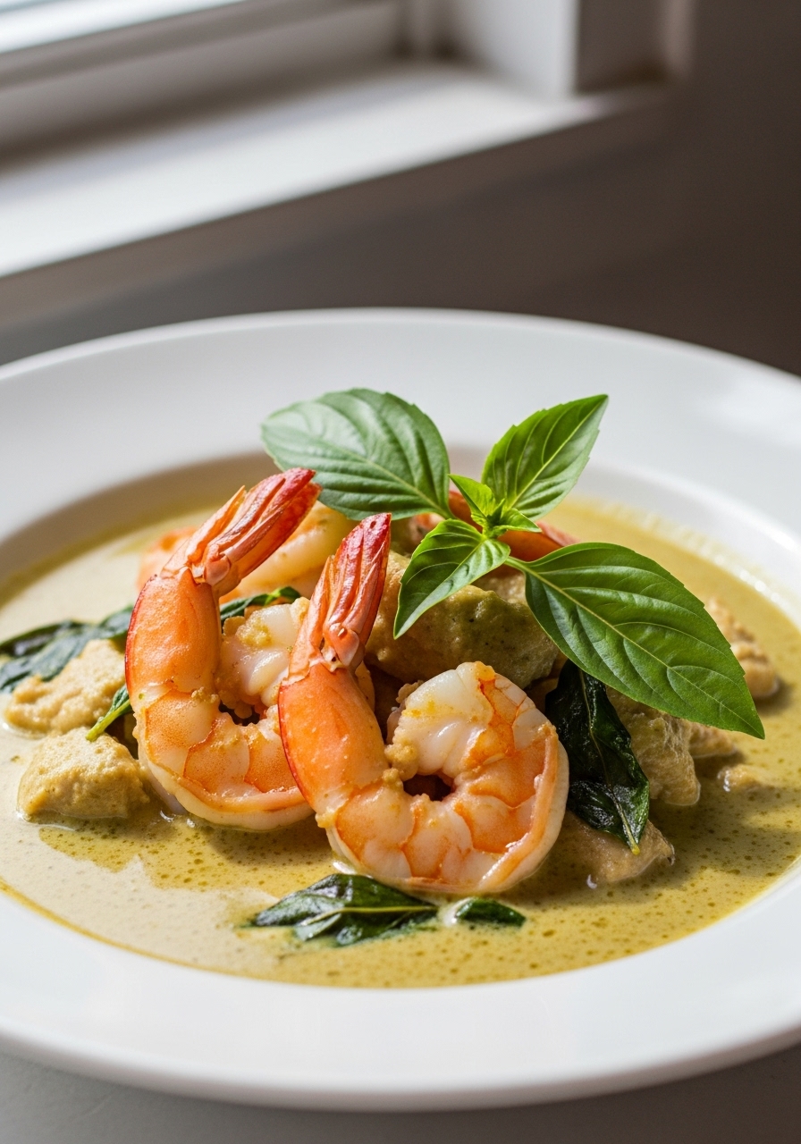 "Experience the vibrant flavors of Thai cuisine with this quick and simple shrimp dish. In just under 10 minutes, succulent shrimp are combined with creamy coconut milk and aromatic green curry paste, finished off with fresh basil for a delightful Thai green curry shrimp that’s sure to impress!"