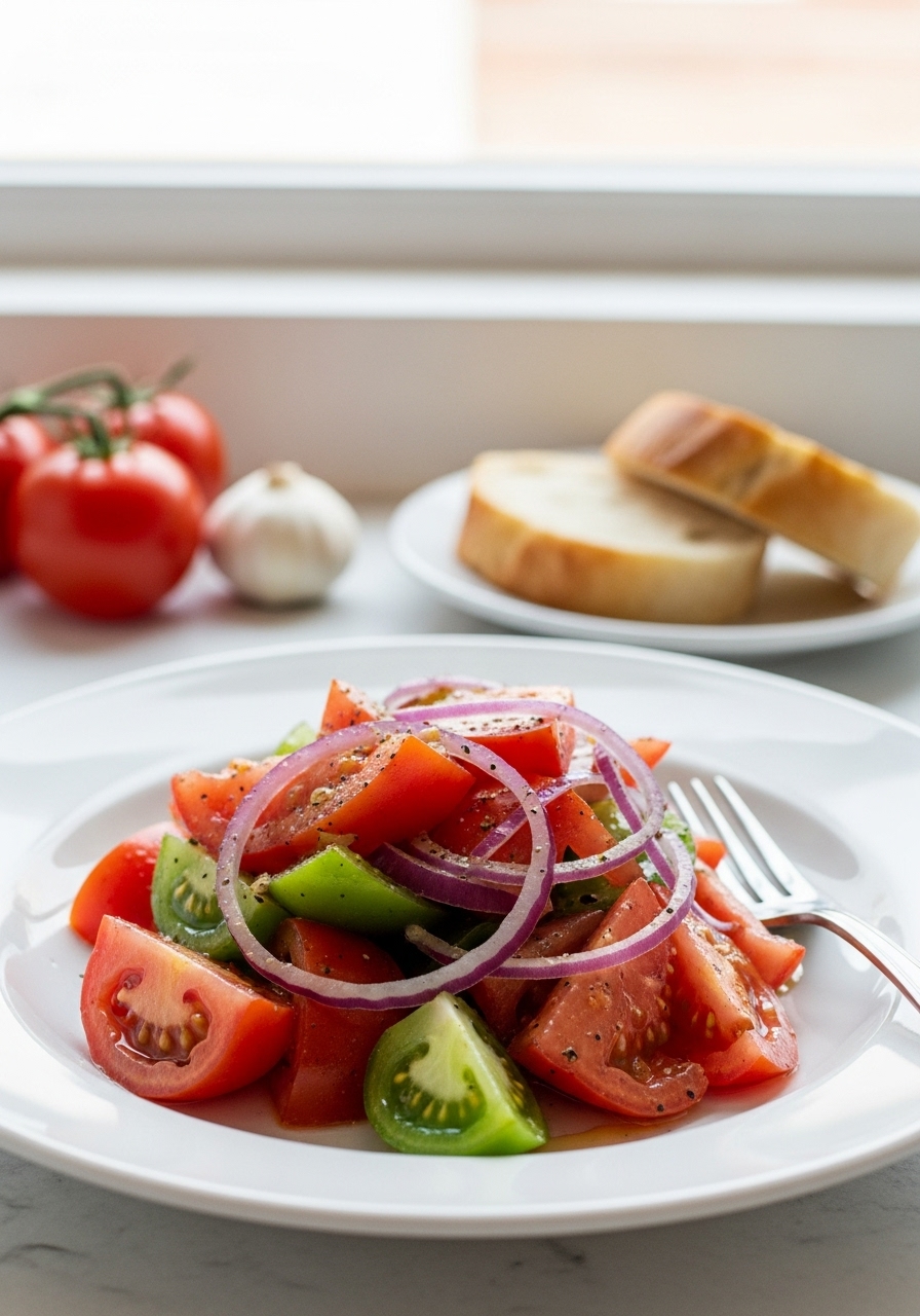 Harvested at the peak of their season, succulent summer tomatoes create an incredibly flavorful tomato salad that pairs wonderfully with a hearty loaf of artisan bread!