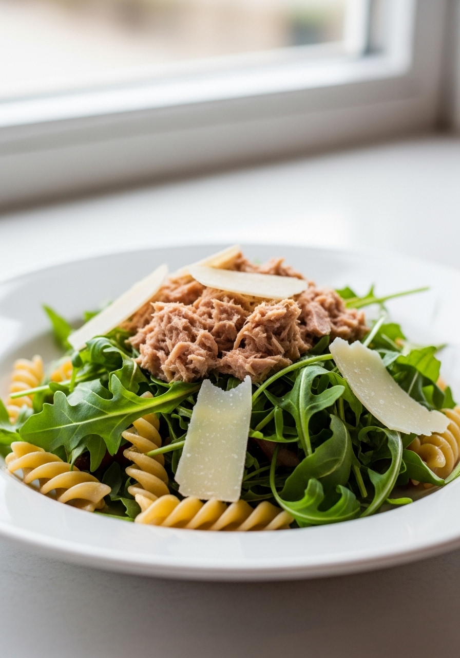 In a spacious mixing bowl, combine the tuna with capers, olive oil, vinegar, arugula, cooked pasta, and a sprinkle of pepper. Gently mix until all ingredients are well incorporated.