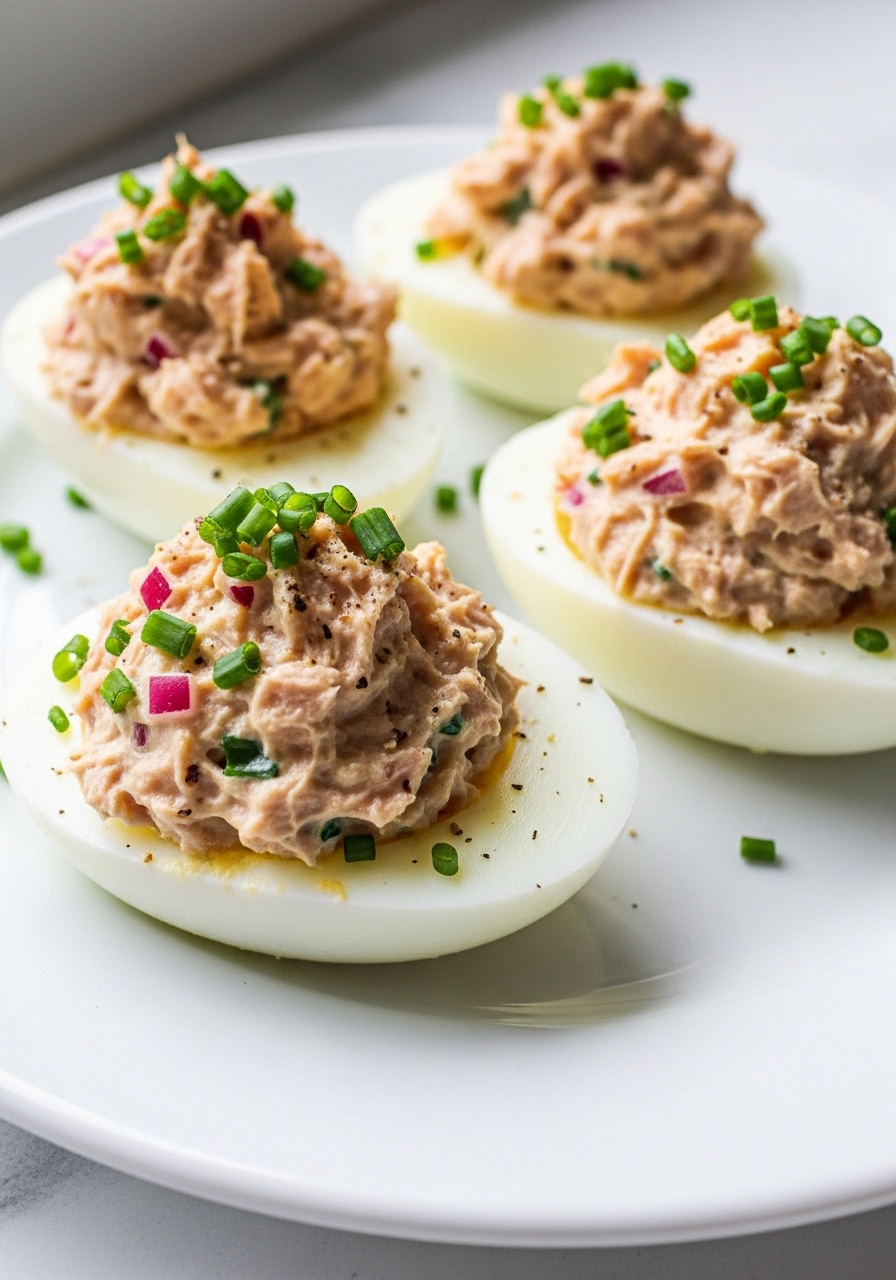 These Deviled Eggs filled with Tuna Salad are an ideal choice for a lunchbox treat or a delightful starter at your next gathering!