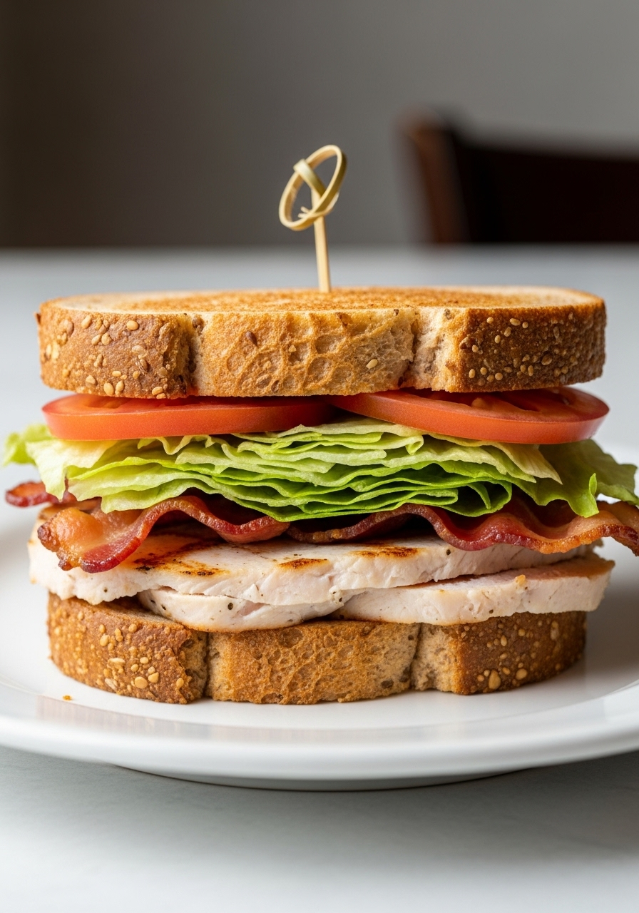 Introducing a healthier twist on the timeless Turkey Club sandwich! This delightful creation features layers of tender turkey breast, crispy bacon, fresh lettuce, and juicy tomato, all nestled between slices of nutritious whole grain bread. It's the ideal choice for a quick and satisfying lunch that doesn’t compromise on flavor.