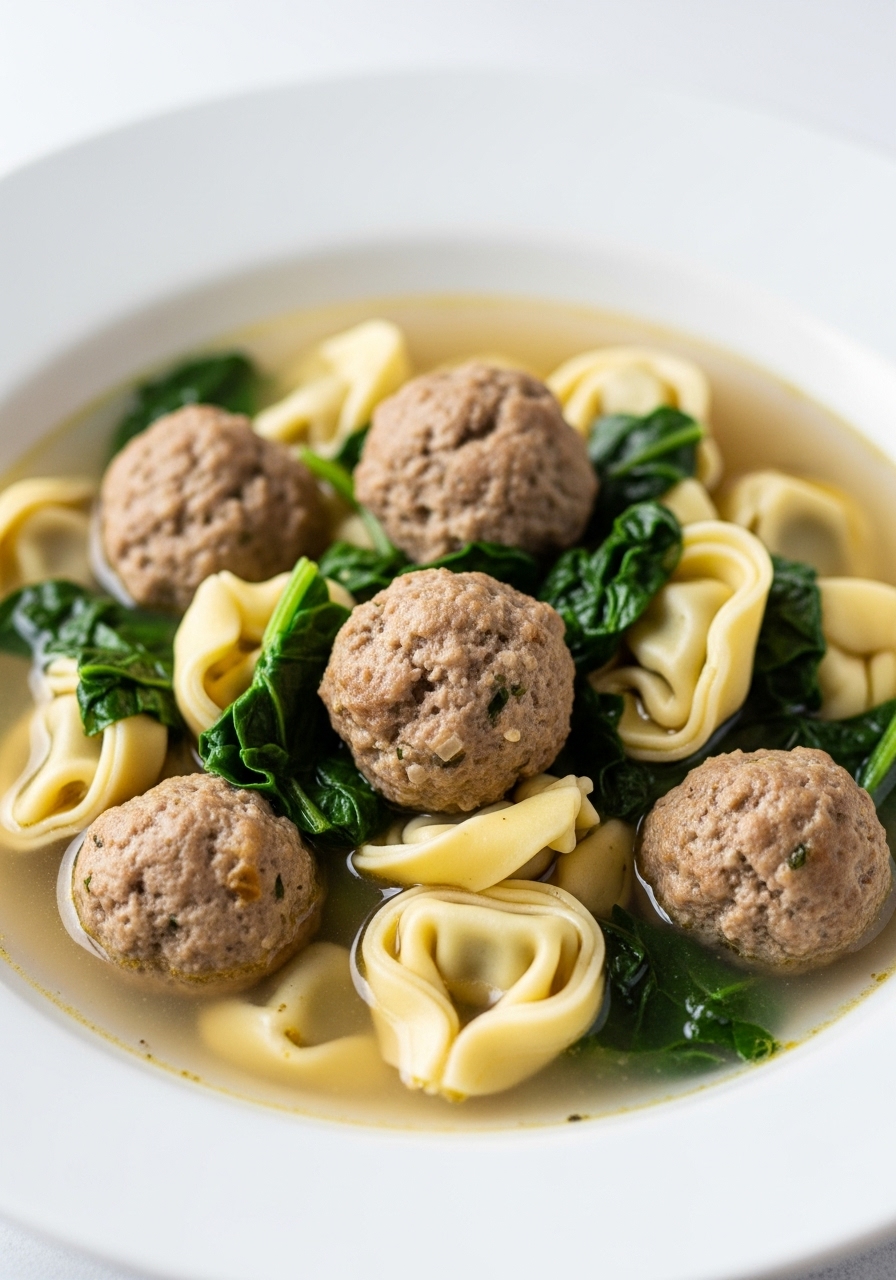 After the tortellini is cooked, remove the Parmesan rind, then stir in the baby spinach until well mixed. Serve the soup with a sprinkle of freshly grated Parmigiano Reggiano on top.