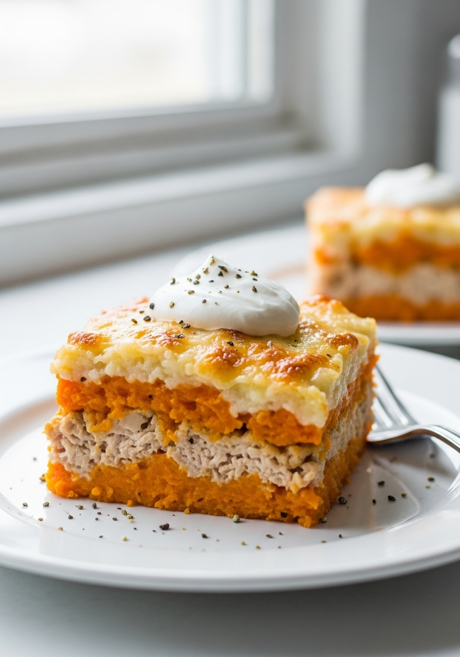 For the sweet potato topping: In a pot, bring salted water to a boil and add the sweet potatoes along with the garlic. Cook until they are tender. Once done, drain the water and mash them together with chicken broth, milk, sour cream, and a pinch of salt and pepper.