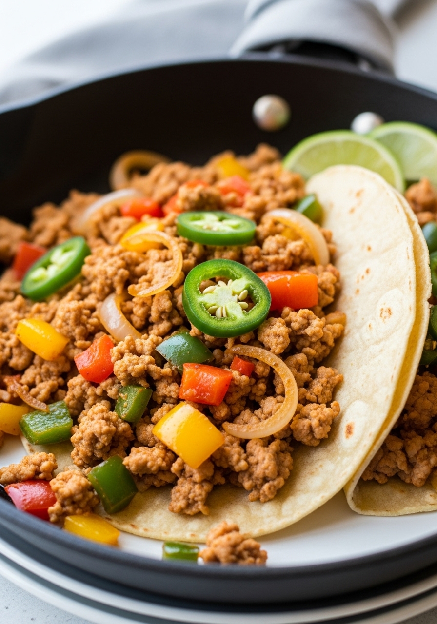 Take the skillet off the heat and garnish the turkey mixture with freshly chopped cilantro, pickled red onions, diced tomatoes, and optional toppings such as avocado, guacamole, or sour cream, if you like. Serve alongside lime wedges.