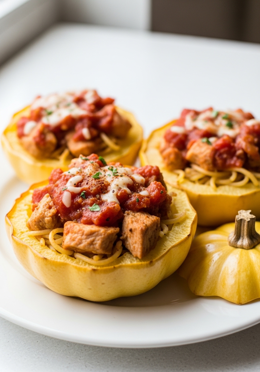 "Discover a delightful twist on spaghetti squash with this recipe! Each boat is generously stuffed with savory turkey taco filling, melted cheese, and finished off with a fresh pico de gallo topping."
