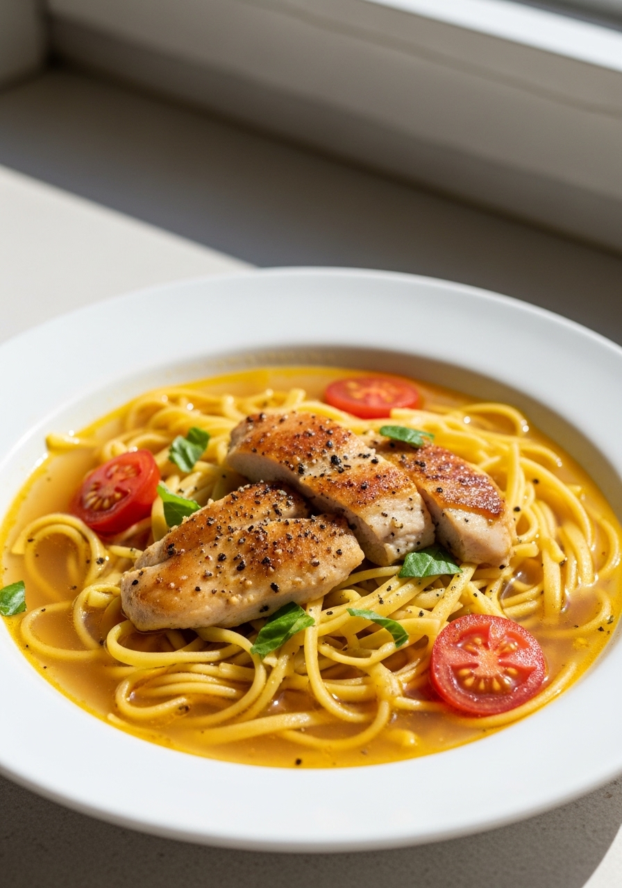 Indulge in this nourishing bowl of Turmeric Chicken Noodle Soup, a flavorful, anti-inflammatory delight brimming with vibrant vegetables, tender chicken, and soft rice noodles.