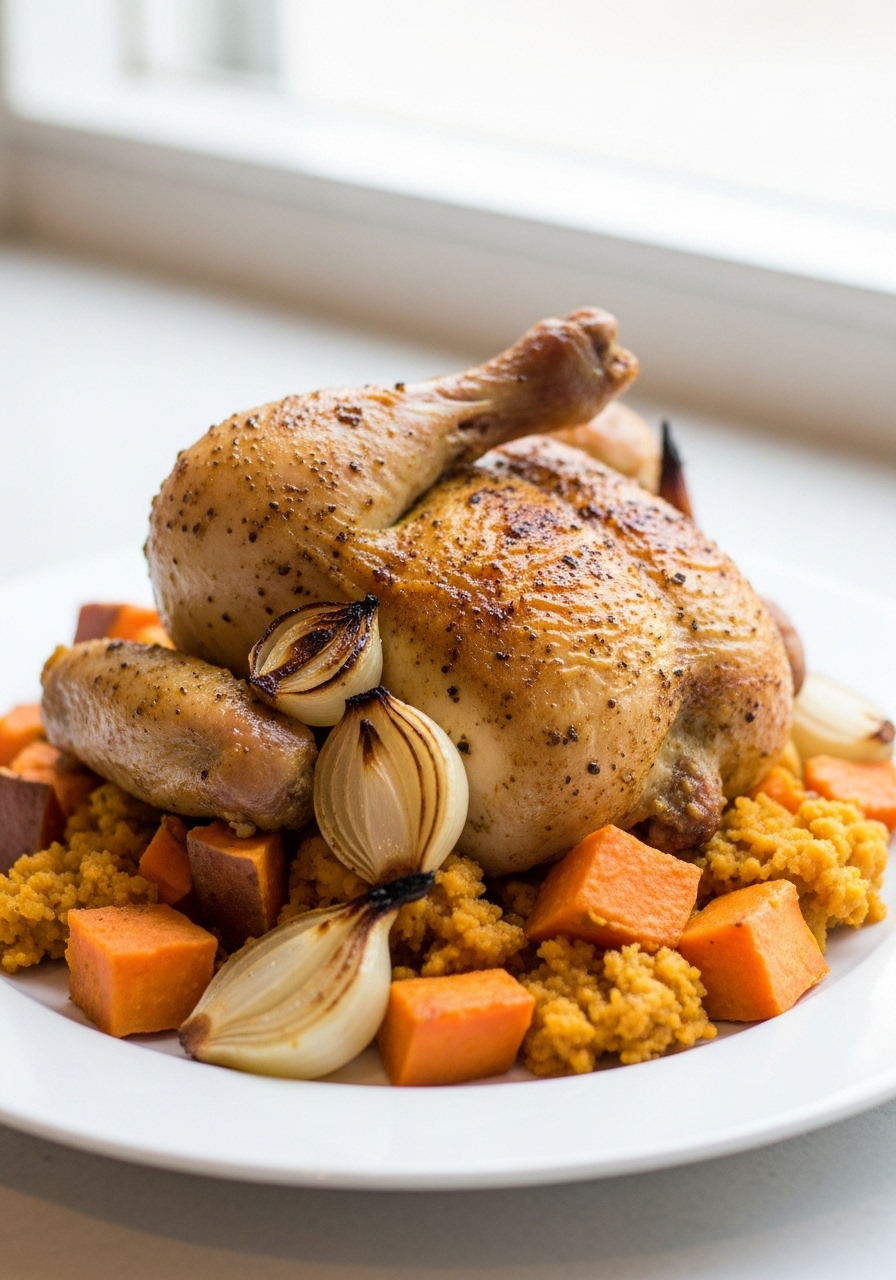 Golden sweet potatoes and tender shallots create a delightful base for succulent roasted chicken thighs and legs in this wholesome one-pot chicken dinner. Enjoy the harmonious blend of flavors in this easy and nutritious meal.