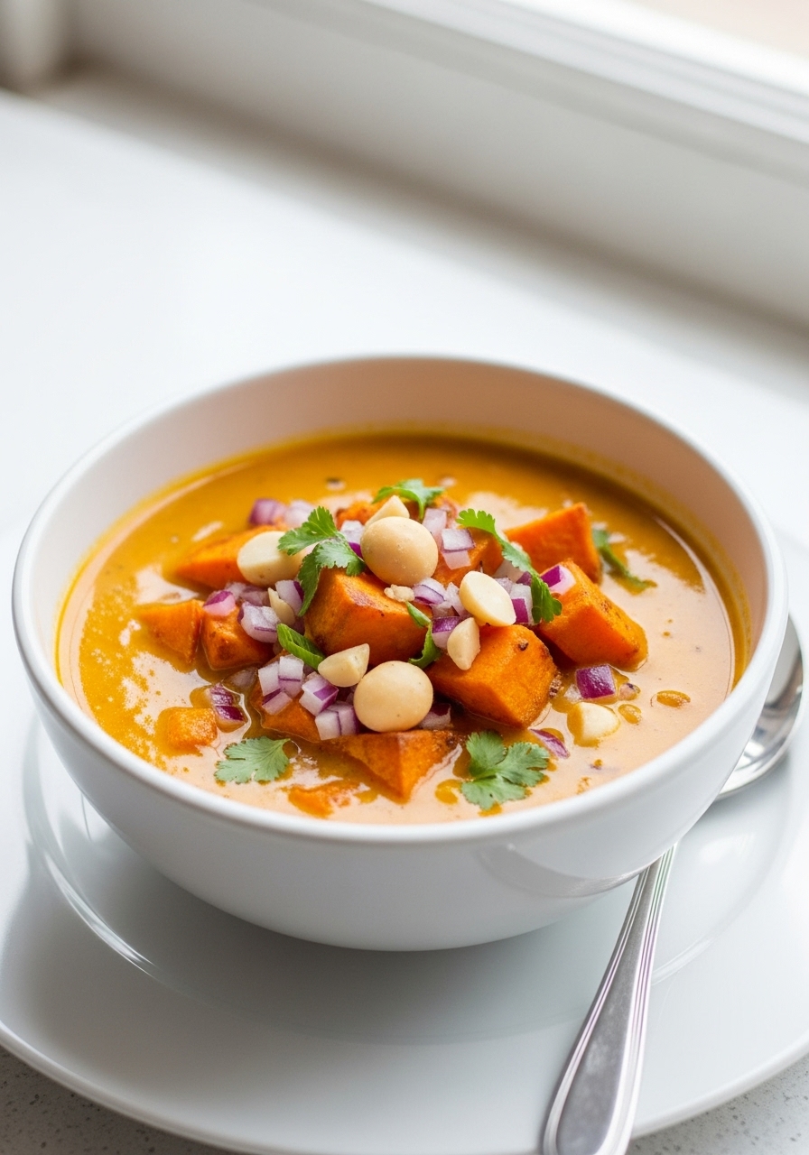 This delightful vegan soup features roasted sweet potatoes infused with turmeric, creating a rich and creamy texture without any dairy. Enhanced by the addition of macadamia nuts and a hint of ginger, it’s finished off with a zesty splash of lime juice for an extra layer of flavor.