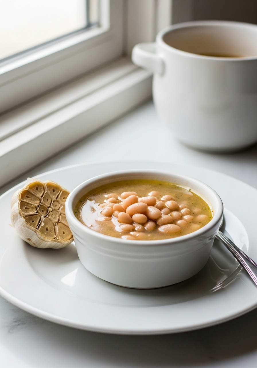 When the beans have softened, stir in the bouillon and mix thoroughly until it dissolves. Then, carefully transfer a portion of the beans and broth along with the roasted garlic into a blender.