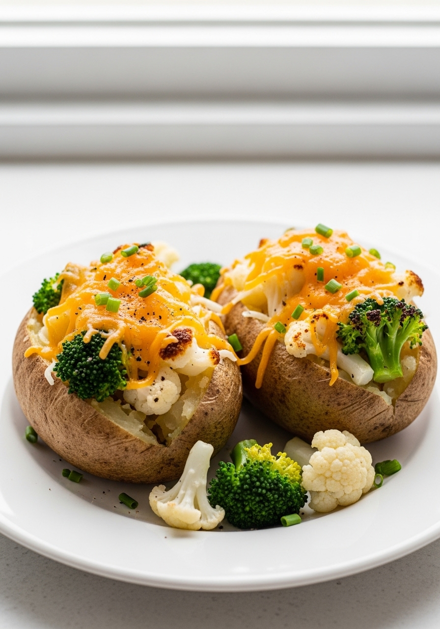 Indulge in these twice-baked potatoes, overflowing with a delightful blend of cheese, broccoli, and a sneaky addition of cauliflower that remains completely undetectable. You won't believe how deliciously creamy and flavorful they are!