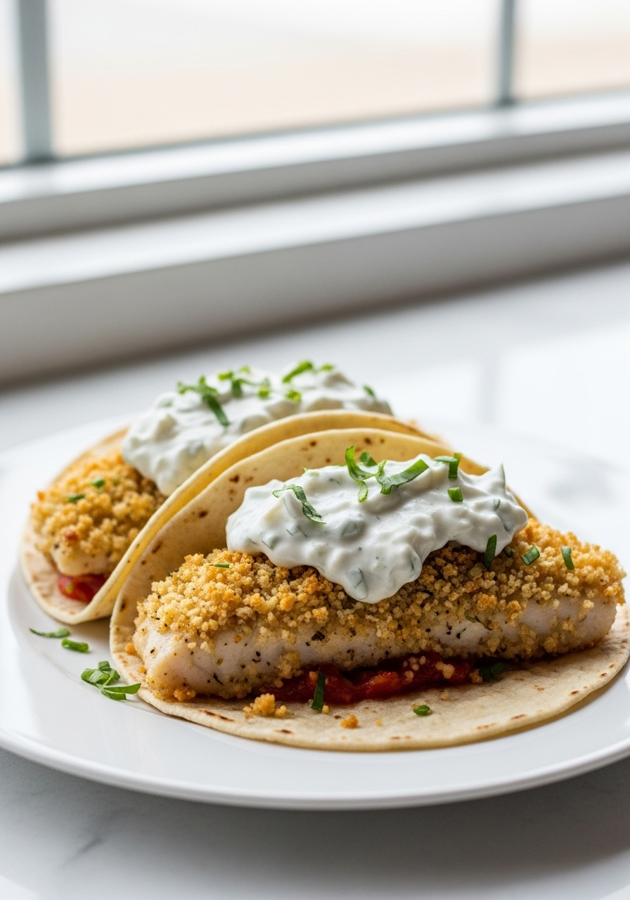 Tzatziki Fish Tacos bring a delightful Greek flair to your meal! These delicious tacos feature crispy breaded white fish fillets, generously drizzled with refreshing mint tzatziki sauce.