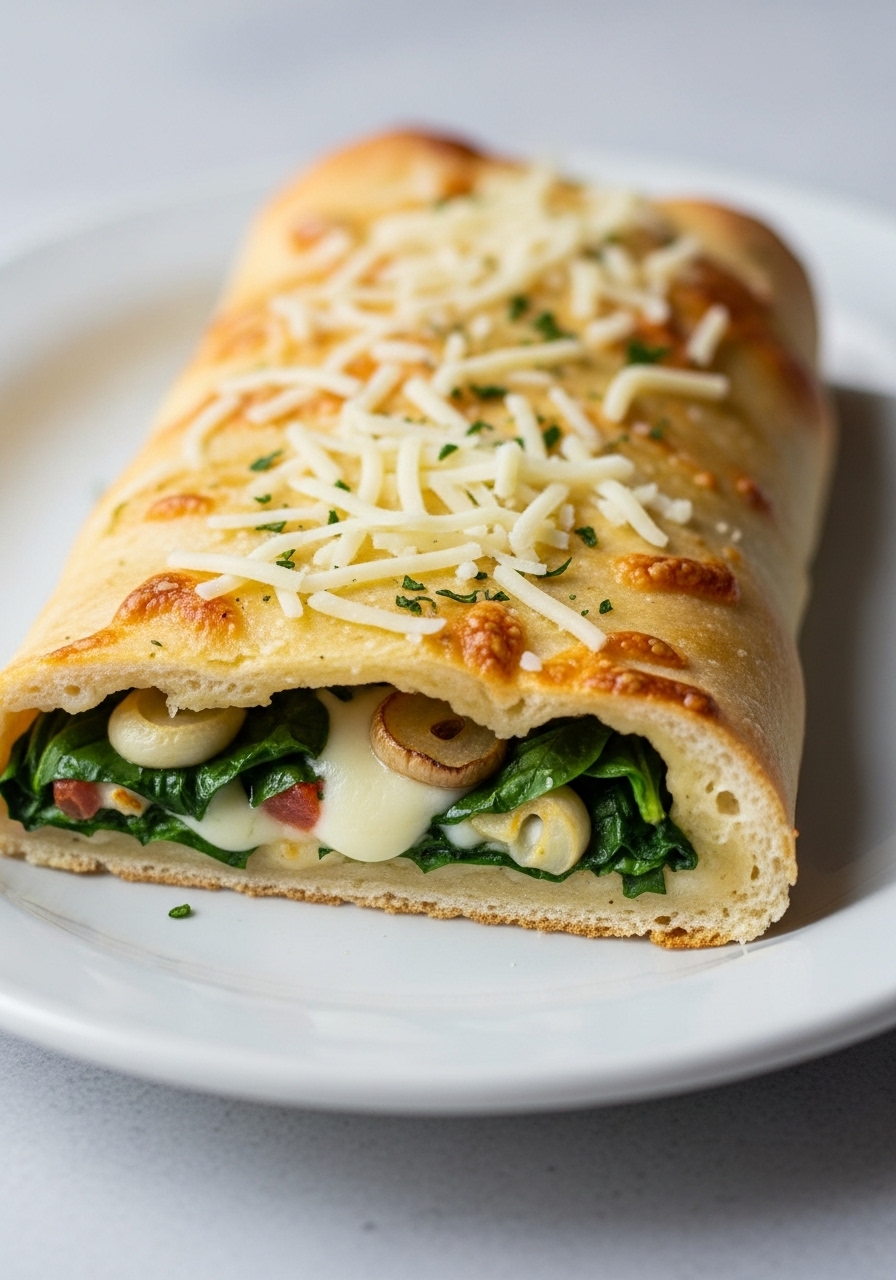 This delightful vegetarian stromboli is filled with a savory blend of mushrooms, spinach, and gooey mozzarella. It's a bit on the messy side, so be ready to dive in and enjoy the fun of eating with your hands!