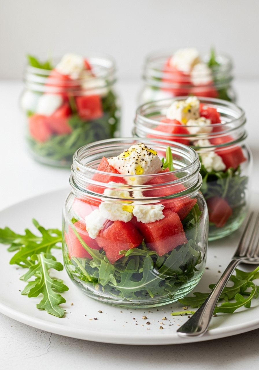 Pour the dressing evenly into 4 pint-sized glass jars. Next, layer the ingredients by adding the onion, followed by the feta, then the watermelon, and top it off with 3/4 cup of arugula.