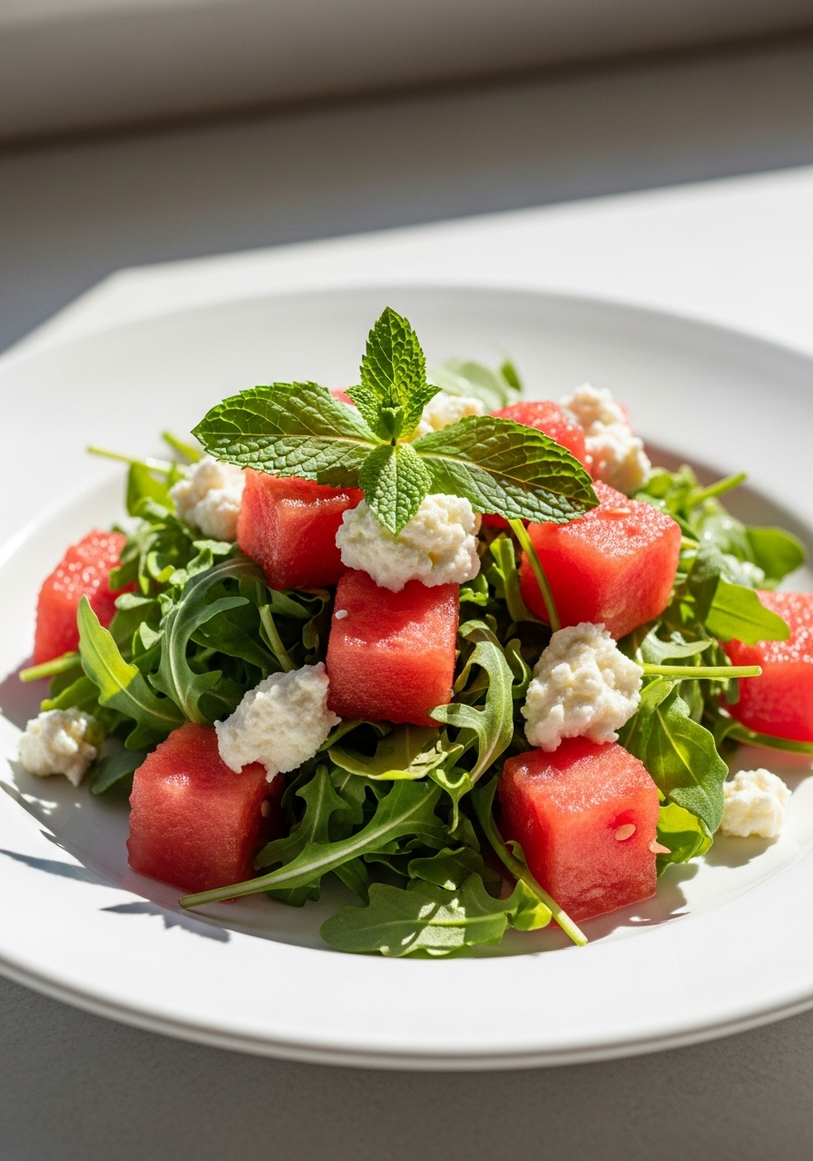Layer half of the watermelon into a spacious, shallow serving dish, followed by half of the arugula and feta. Repeat this layering process with the remaining watermelon, arugula, and feta, then finish off the salad by garnishing with fresh mint leaves.