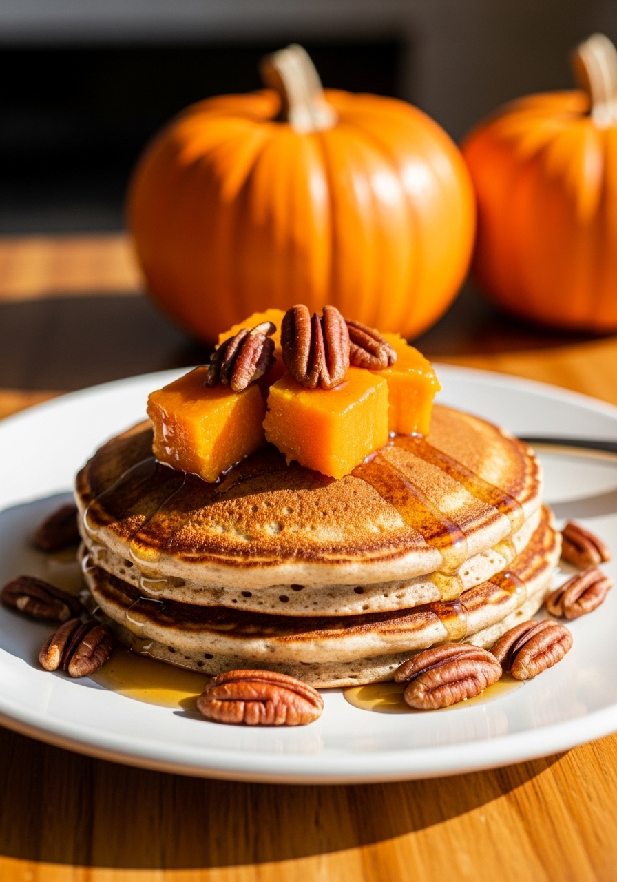 Crafted from whole wheat flour, luscious pumpkin puree, aromatic pumpkin pie spice, and crunchy pecans, these Pumpkin Pancakes are delightfully soft and airy, bursting with the essence of autumn. They make for a speedy and hassle-free breakfast option, and any extras can be conveniently frozen for future enjoyment.