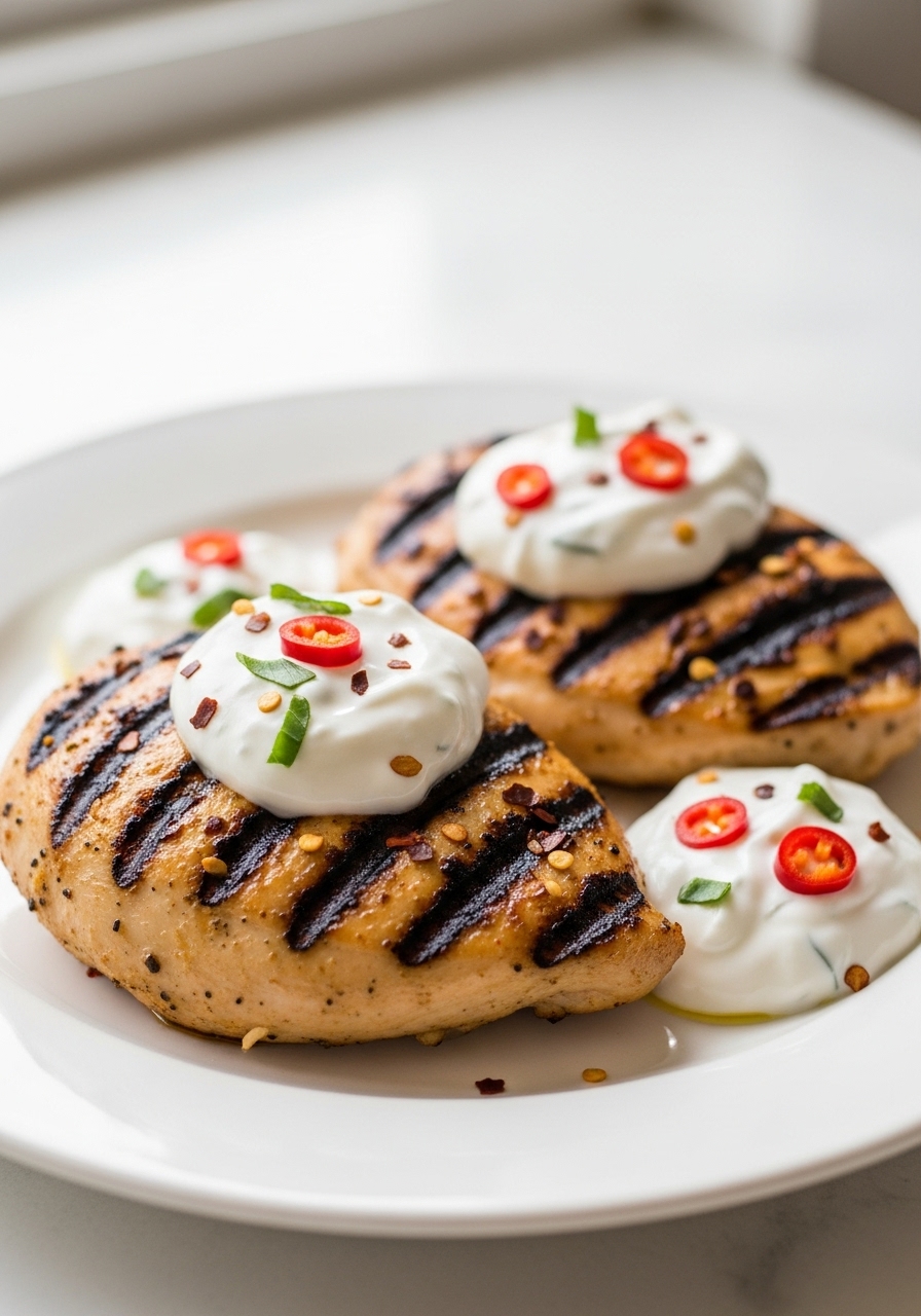"Delicious Yogurt-Marinated Chicken featuring succulent grilled chicken thighs (or breasts) soaked in a creamy Greek yogurt marinade, ensuring the chicken is incredibly tender and flavorful."
